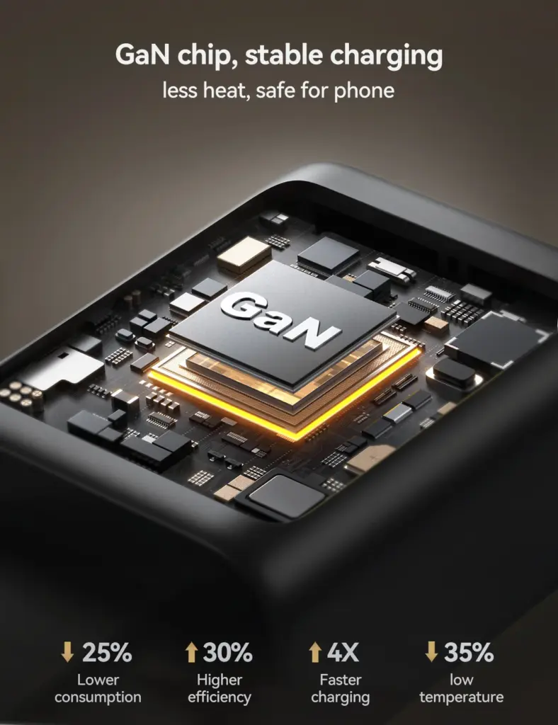 2. GaN chip, stable charging, less heat, safer to use